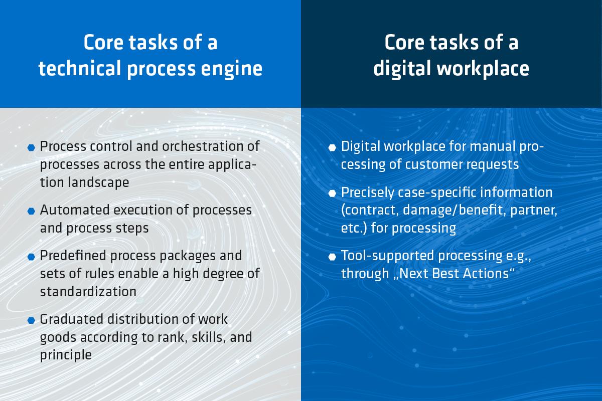 The use of a specialized process engine in conjunction with a digital workstation is ideal for this purpose. By combining the core tasks of these components, customer claims can – on a case-by-case basis – be fully mapped and processed automatically, processed in part automatically and in part manually, or processed entirely manually: